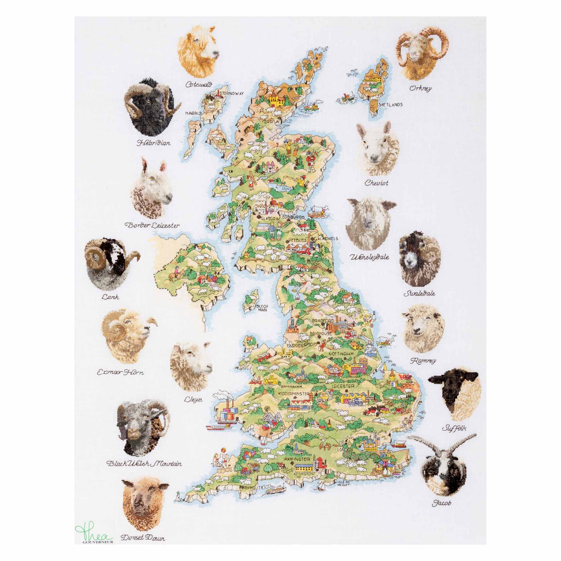 DESIGN: Von der Natur inspirierte Designs sind ein Highlight der Kreuzstich-Kollektion von Thea Gouverneur. Dieses farbenfrohe Kreuzstichmuster zeigt eine Karte der Schafarten in Großbritannien.