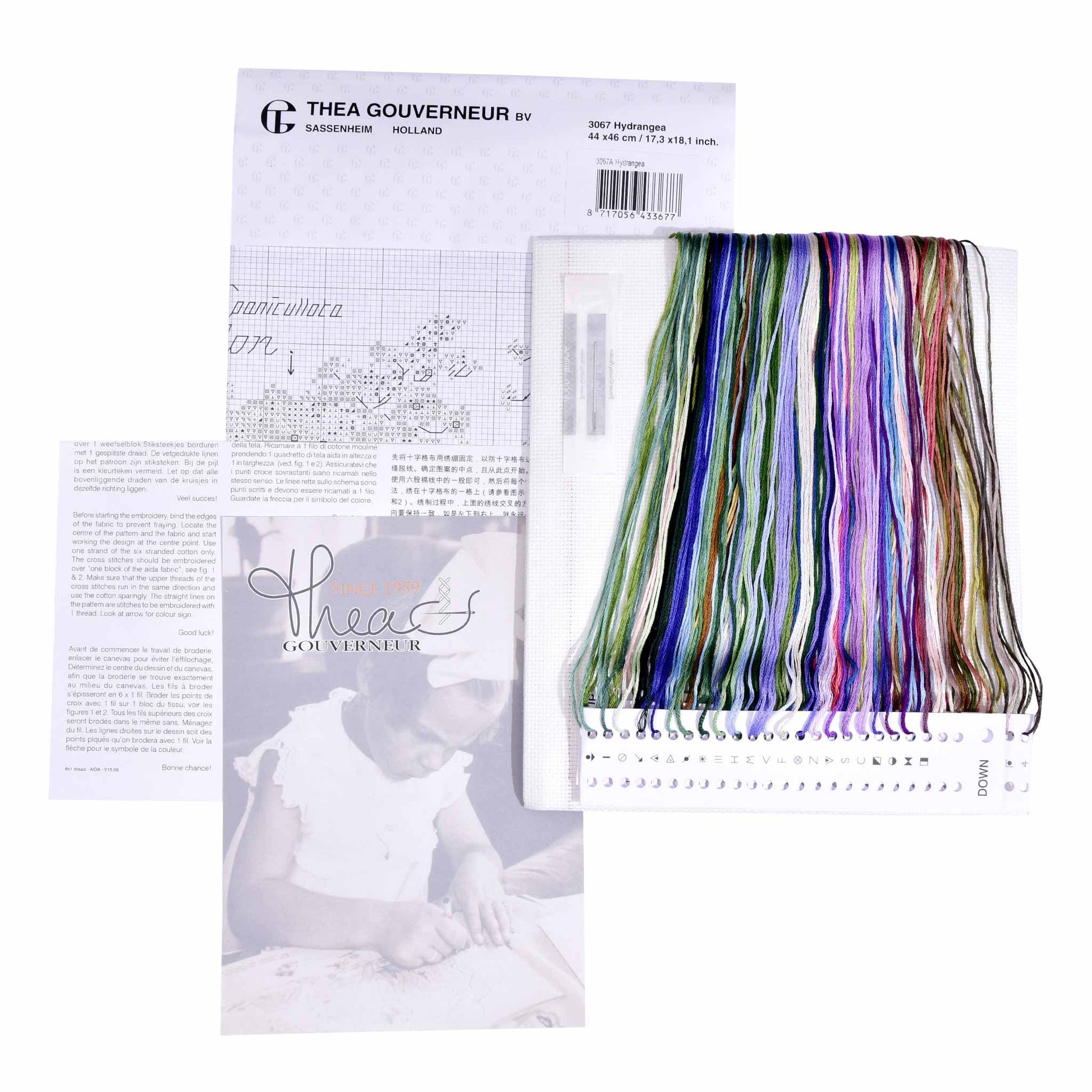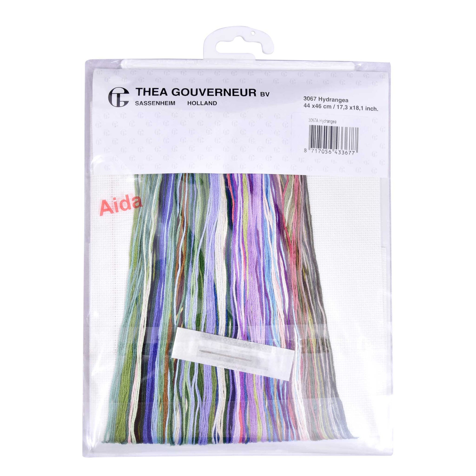 DESIGN : Les motifs inspirés de la nature sont l'un des points forts de la collection de broderies au point de croix Thea Gouverneur. Ce motif coloré au point de croix compte 16 fils et représente un panneau d'hortensias.