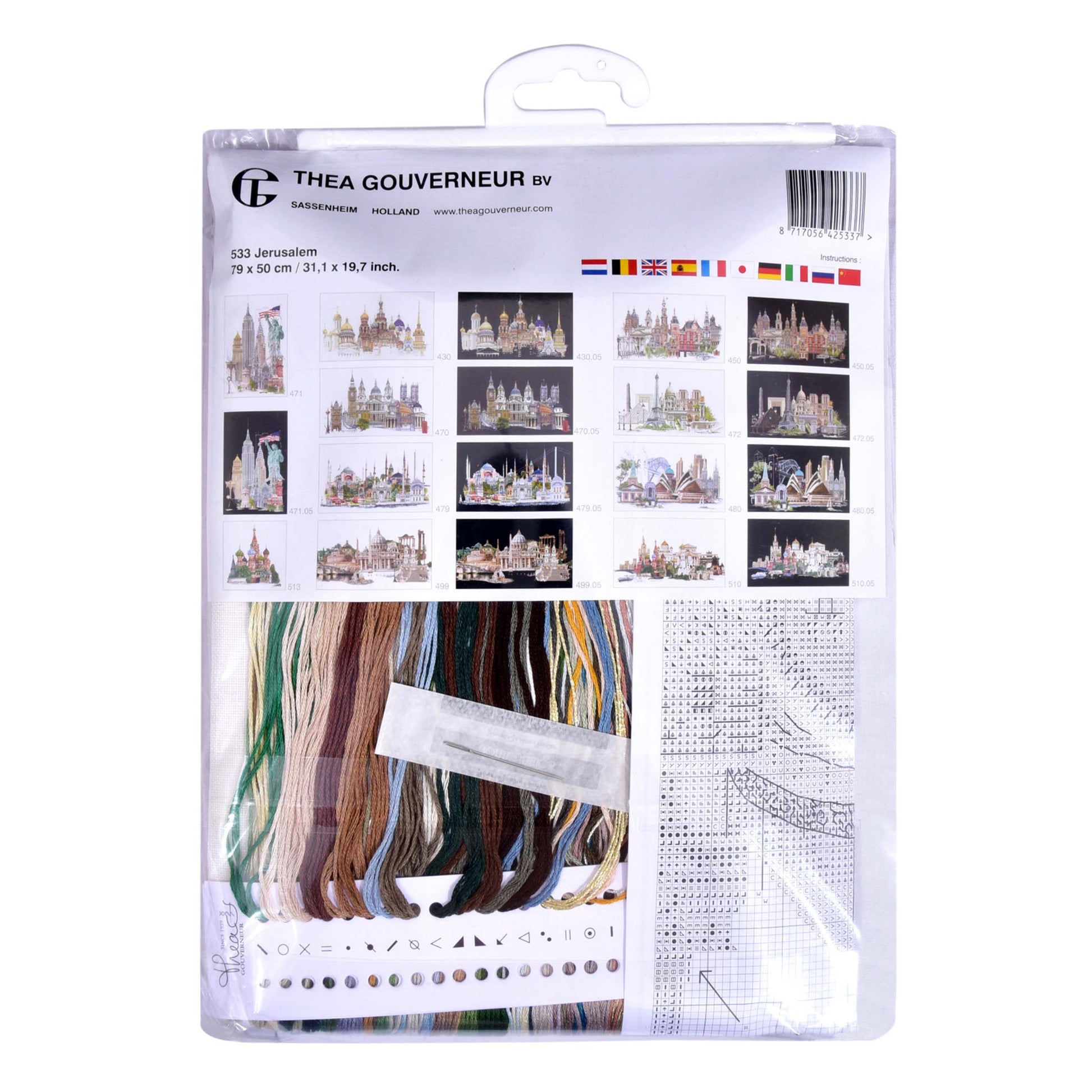 DESIGN : Les motifs paysagers sont l'un des points forts de la collection de broderies au point de croix Thea Gouverneur. Ce motif coloré au point de croix représente une vue de Jérusalem.