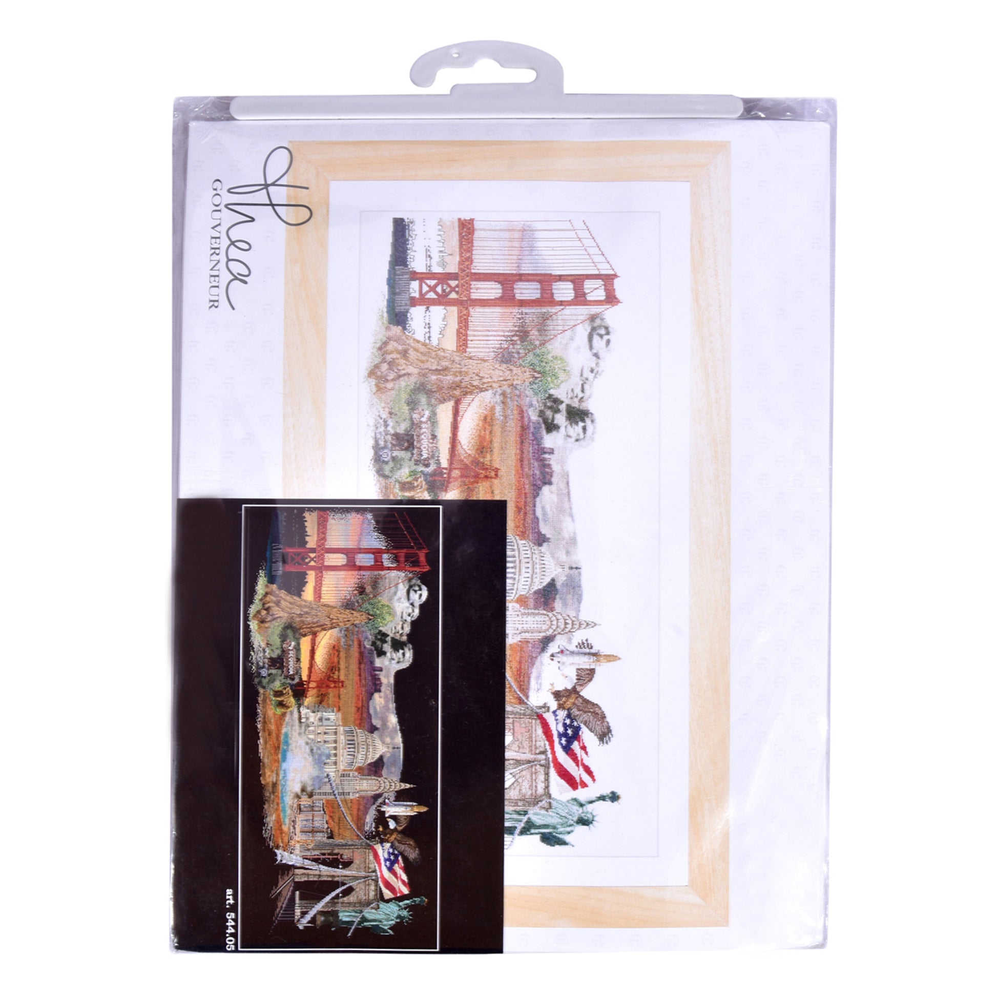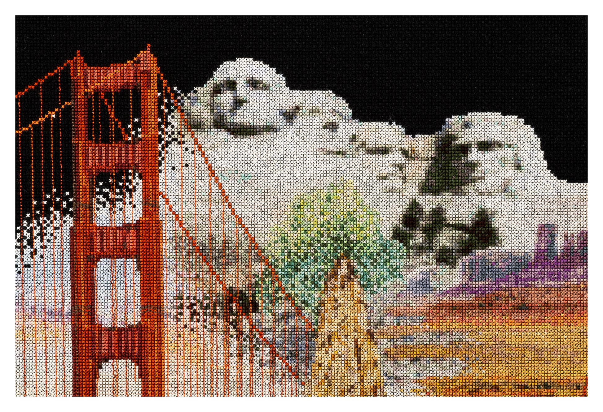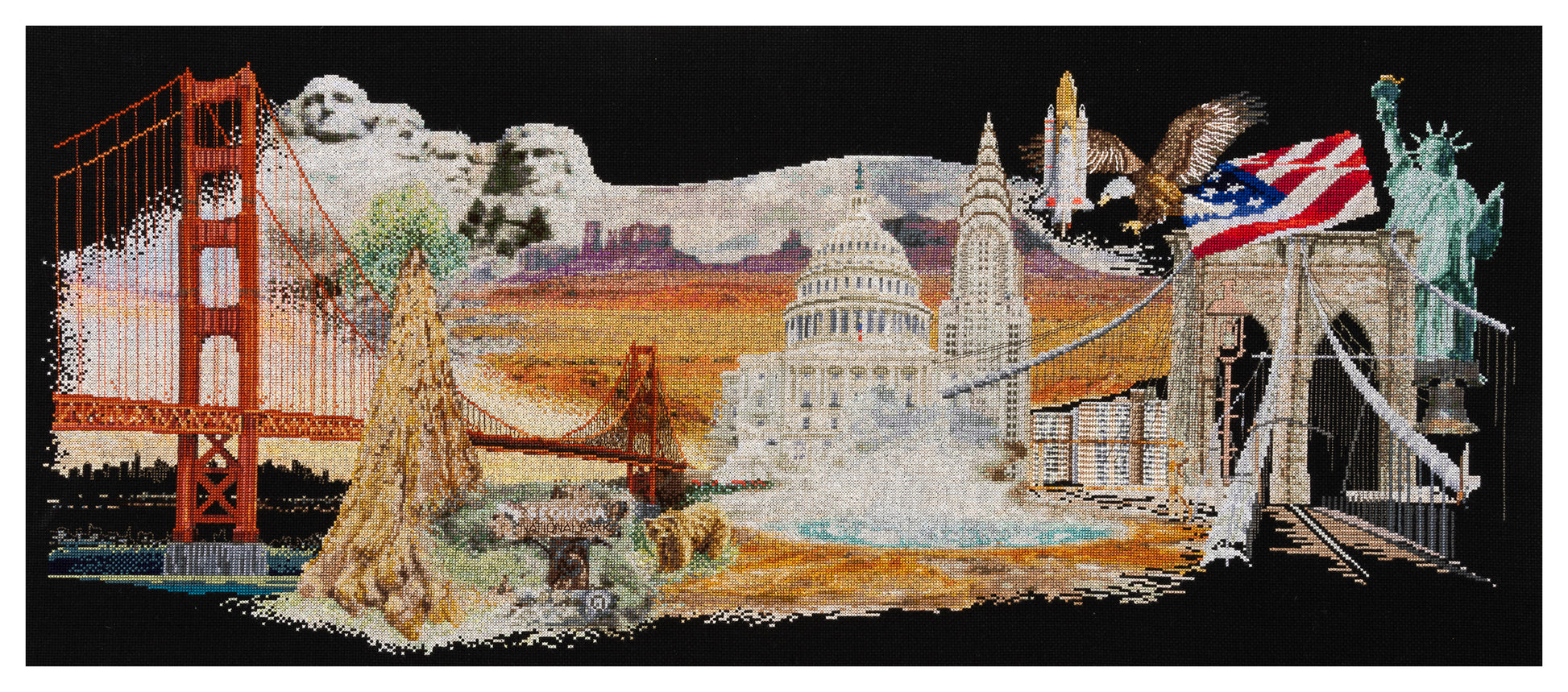 ONTWERP: Landschapsontwerpen zijn een hoogtepunt van de Thea Gouverneur kruissteekcollectie. Dit kleurrijke telpatroon bevat enkele hoogtepunten van de Verenigde Staten