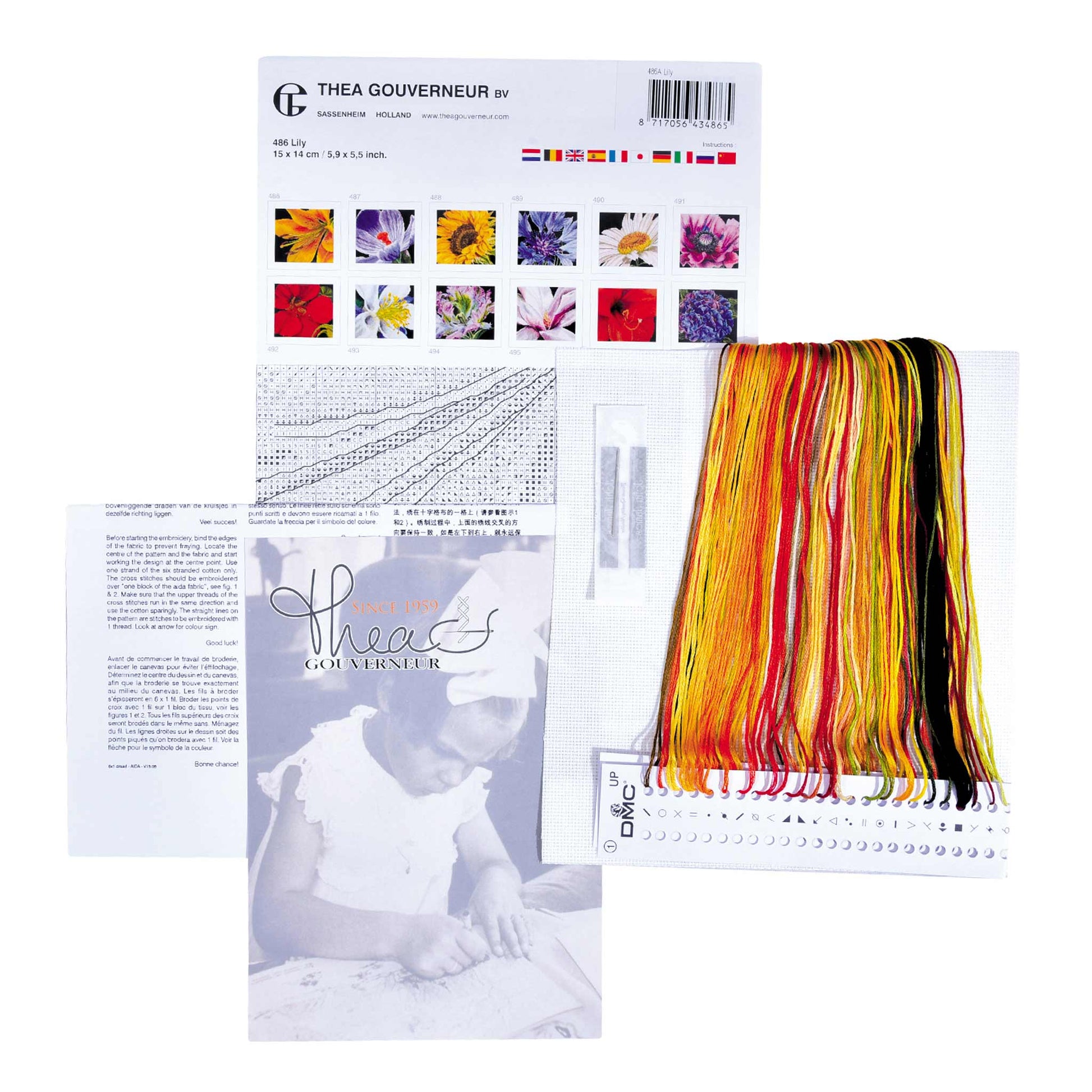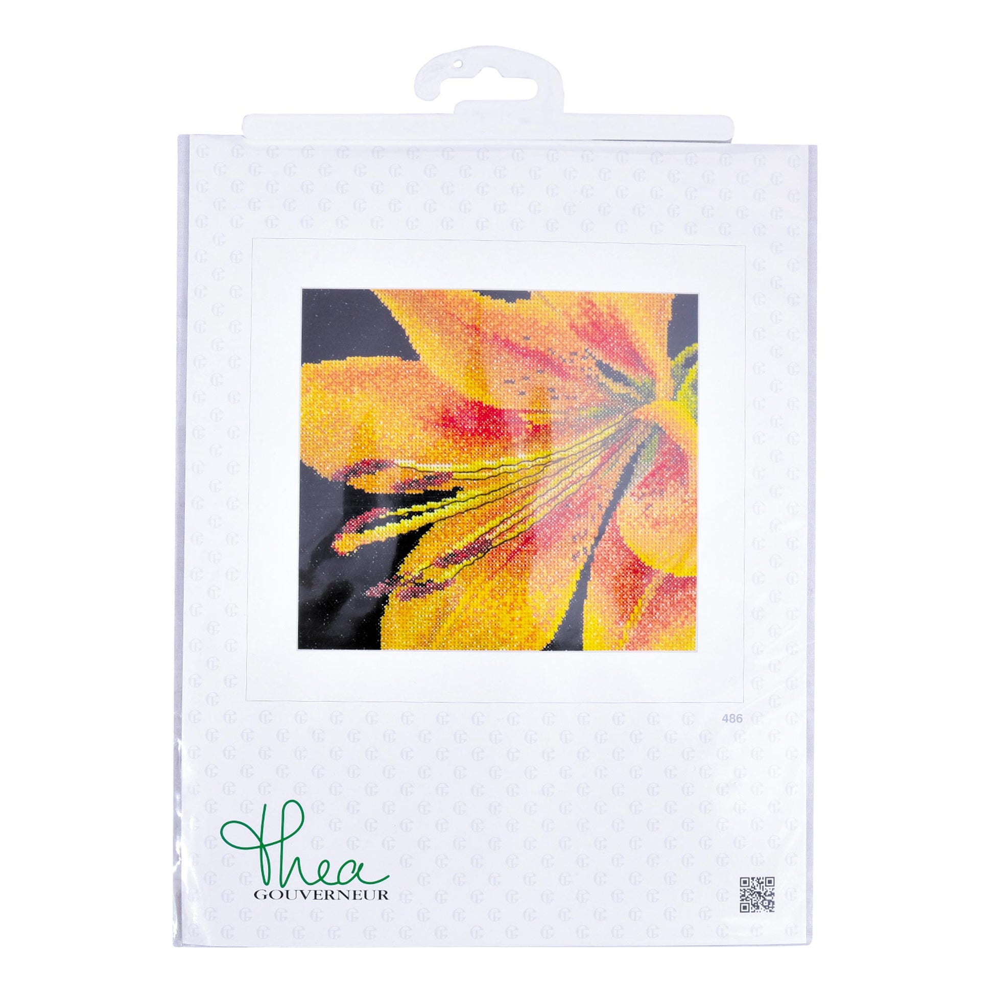 ONTWERP: Ontwerpen geïnspireerd op de natuur zijn een hoogtepunt van de kruissteekcollectie van Thea Gouverneur. Dit getelde kruissteekpatroon heeft een prachtige lelie