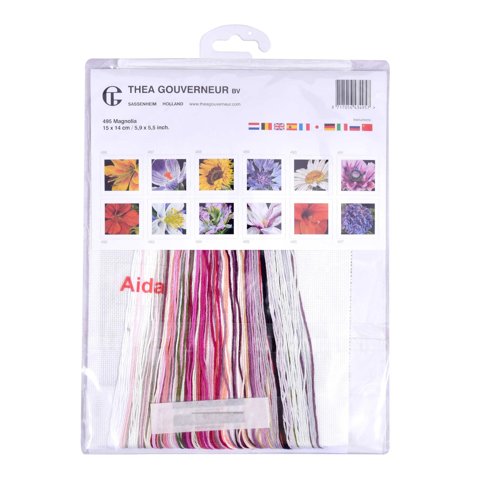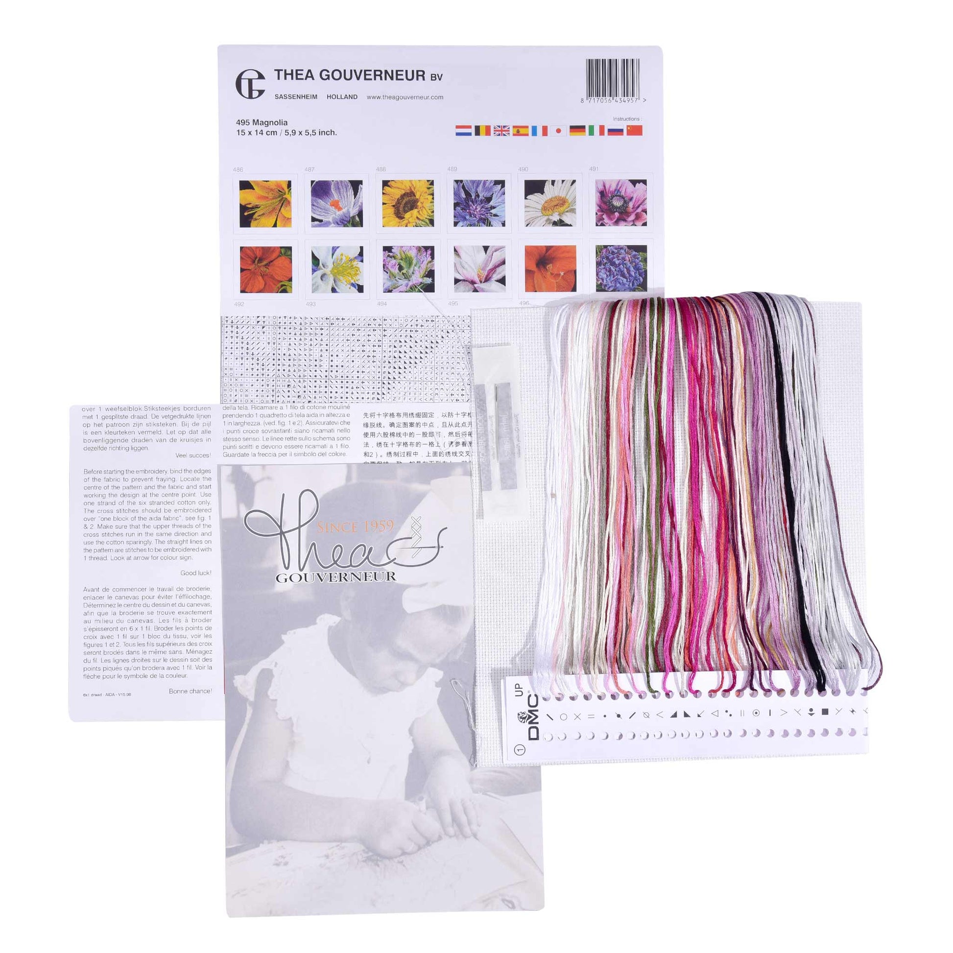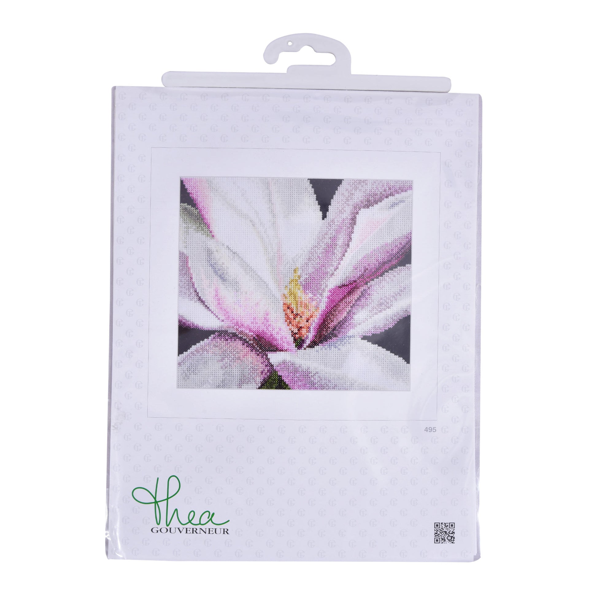ONTWERP: Ontwerpen geïnspireerd op de natuur zijn een hoogtepunt van de kruissteekcollectie van Thea Gouverneur. Dit getelde kruissteekpatroon bevat een prachtige Magnolia