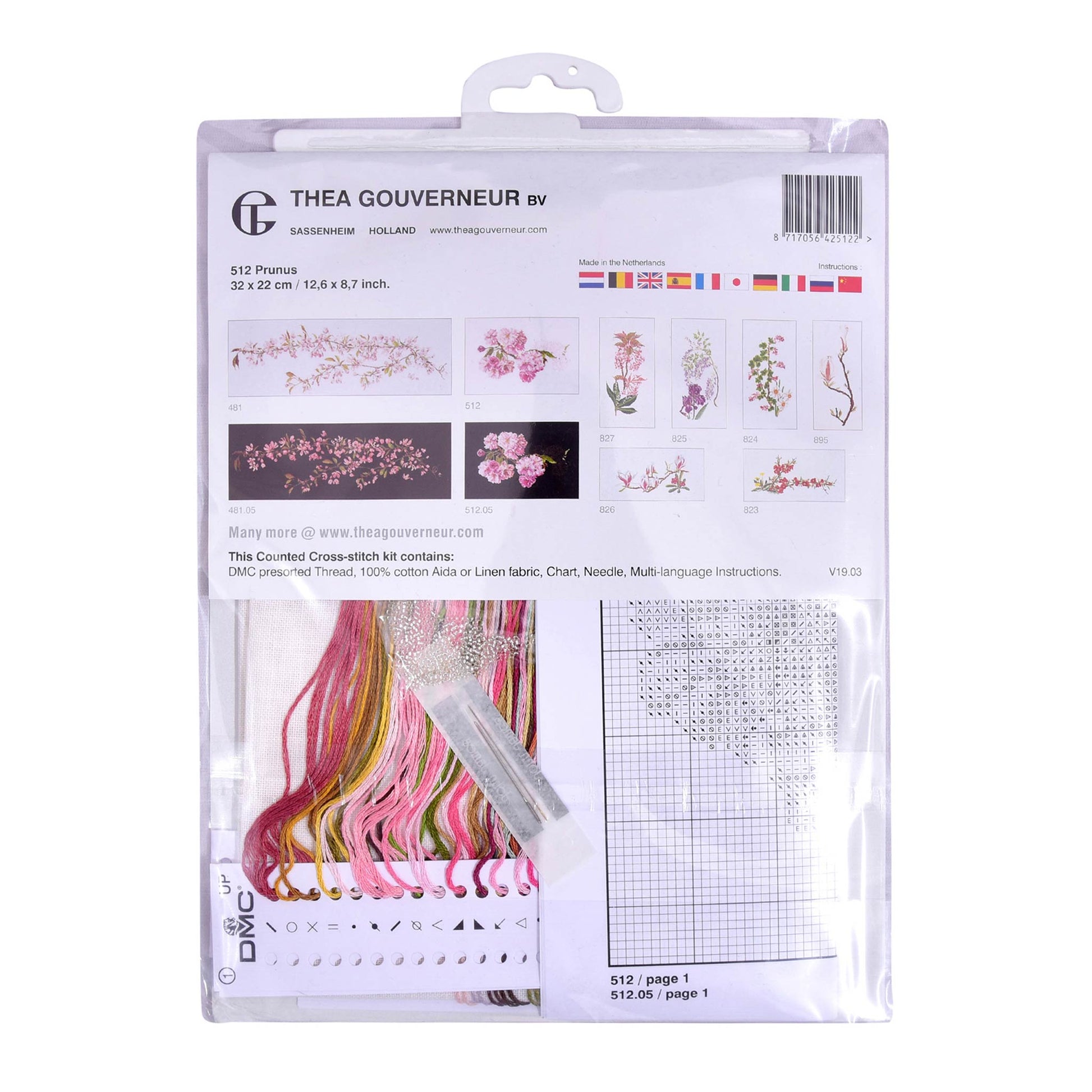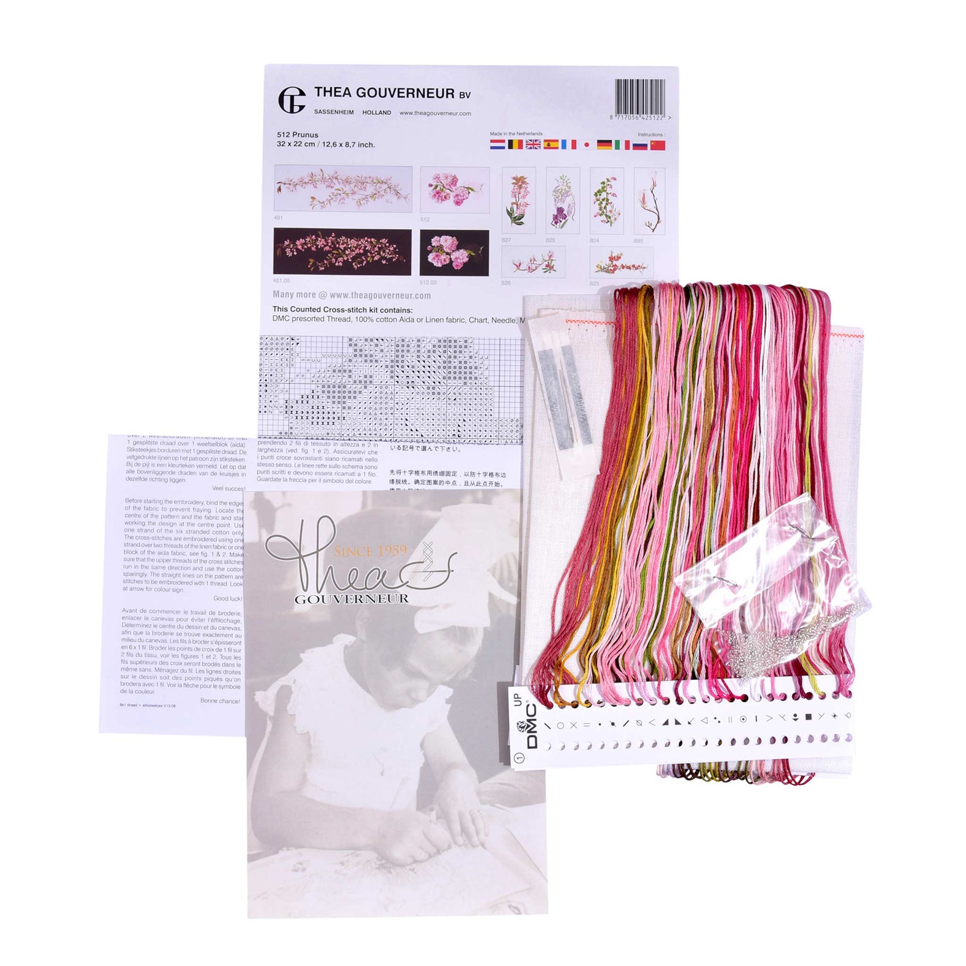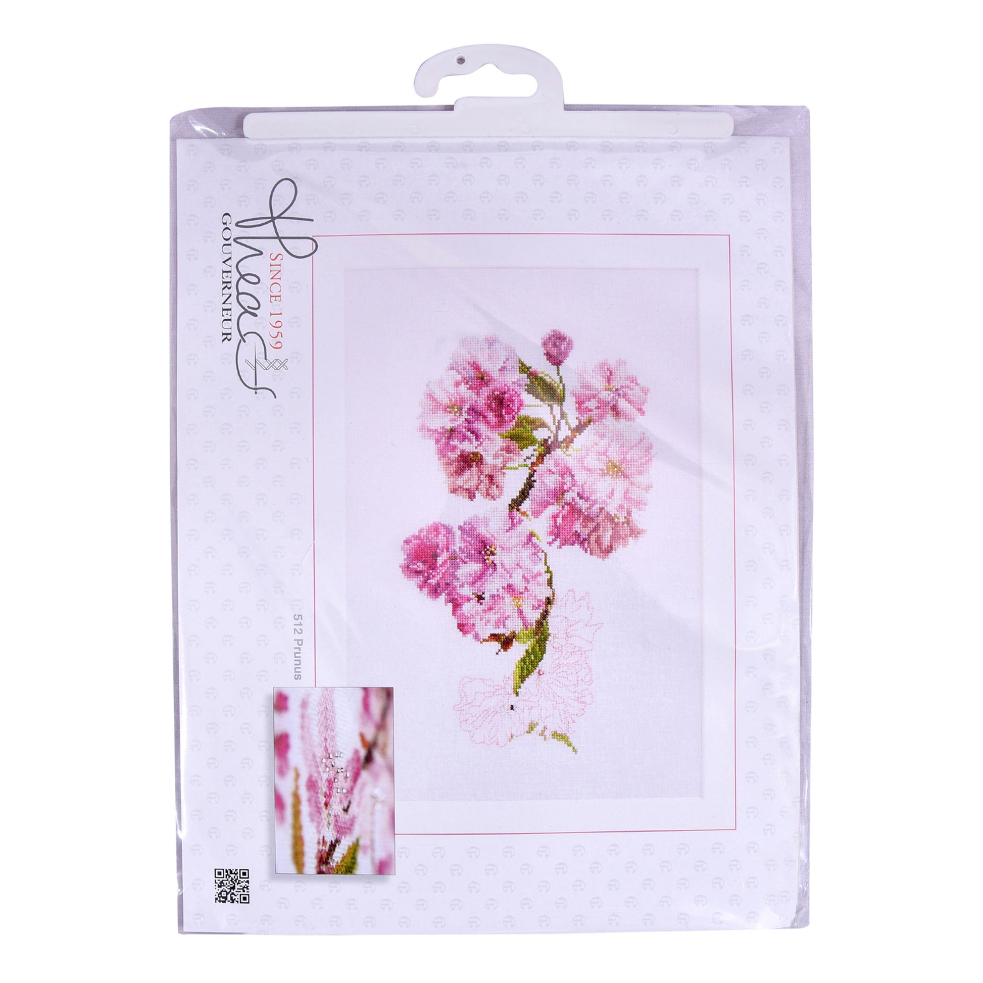 ONTWERP: Ontwerpen geïnspireerd op de natuur zijn een hoogtepunt van de kruissteekcollectie van Thea Gouverneur. Dit getelde kruissteekpatroon bevat een roze Prunus