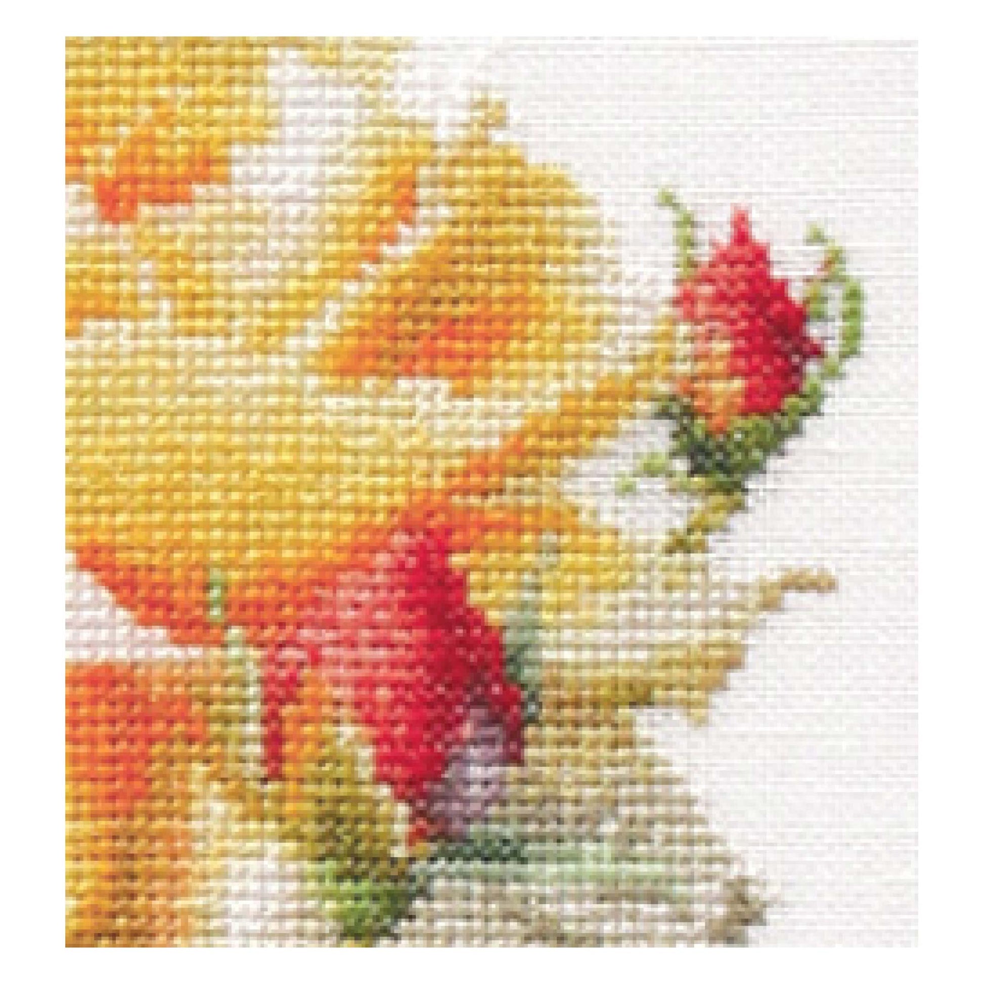 ONTWERP: Ontwerpen geïnspireerd op de natuur zijn een hoogtepunt van de kruissteekcollectie van Thea Gouverneur. Dit kleurrijke kruissteekpatroon toont een tak met een prachtige roos