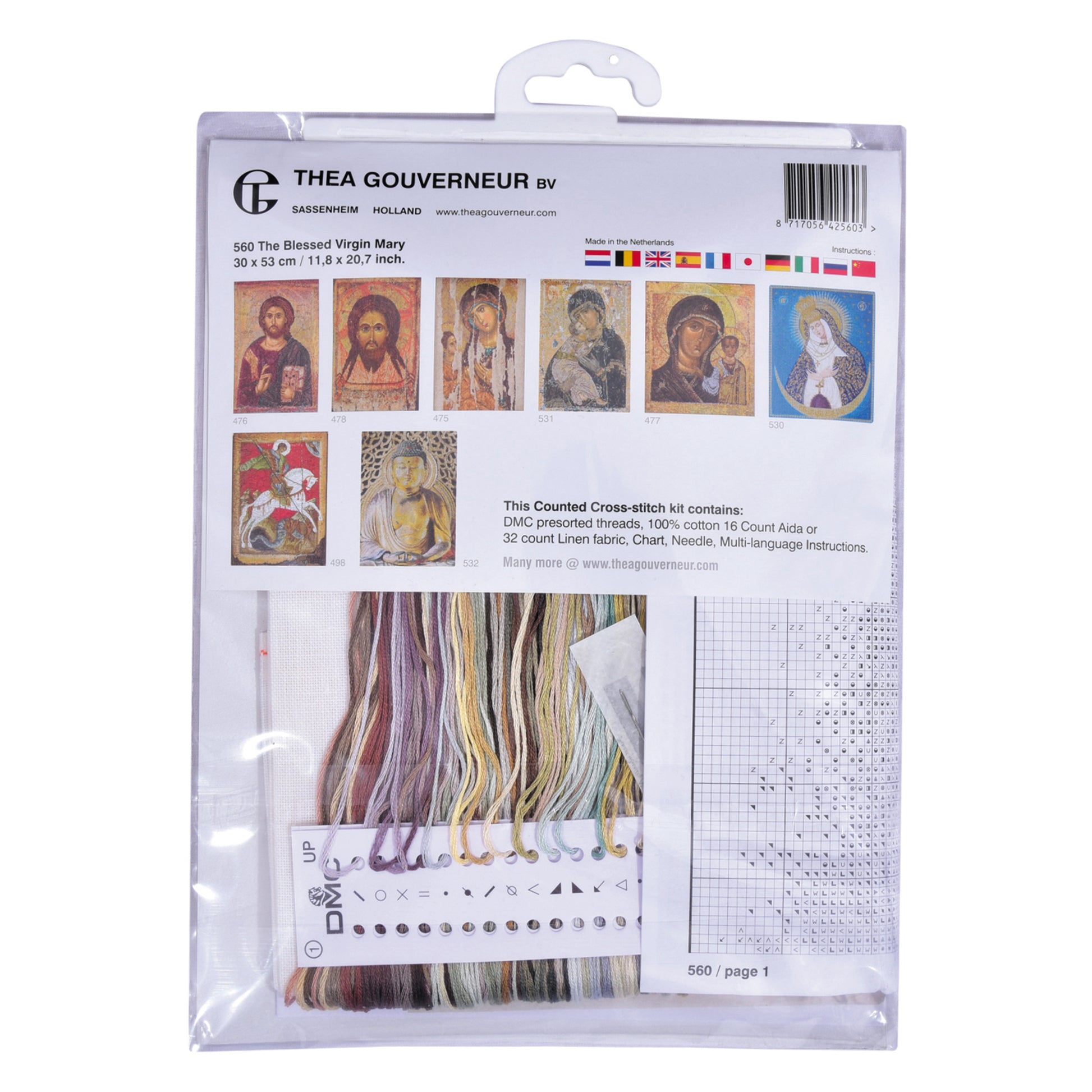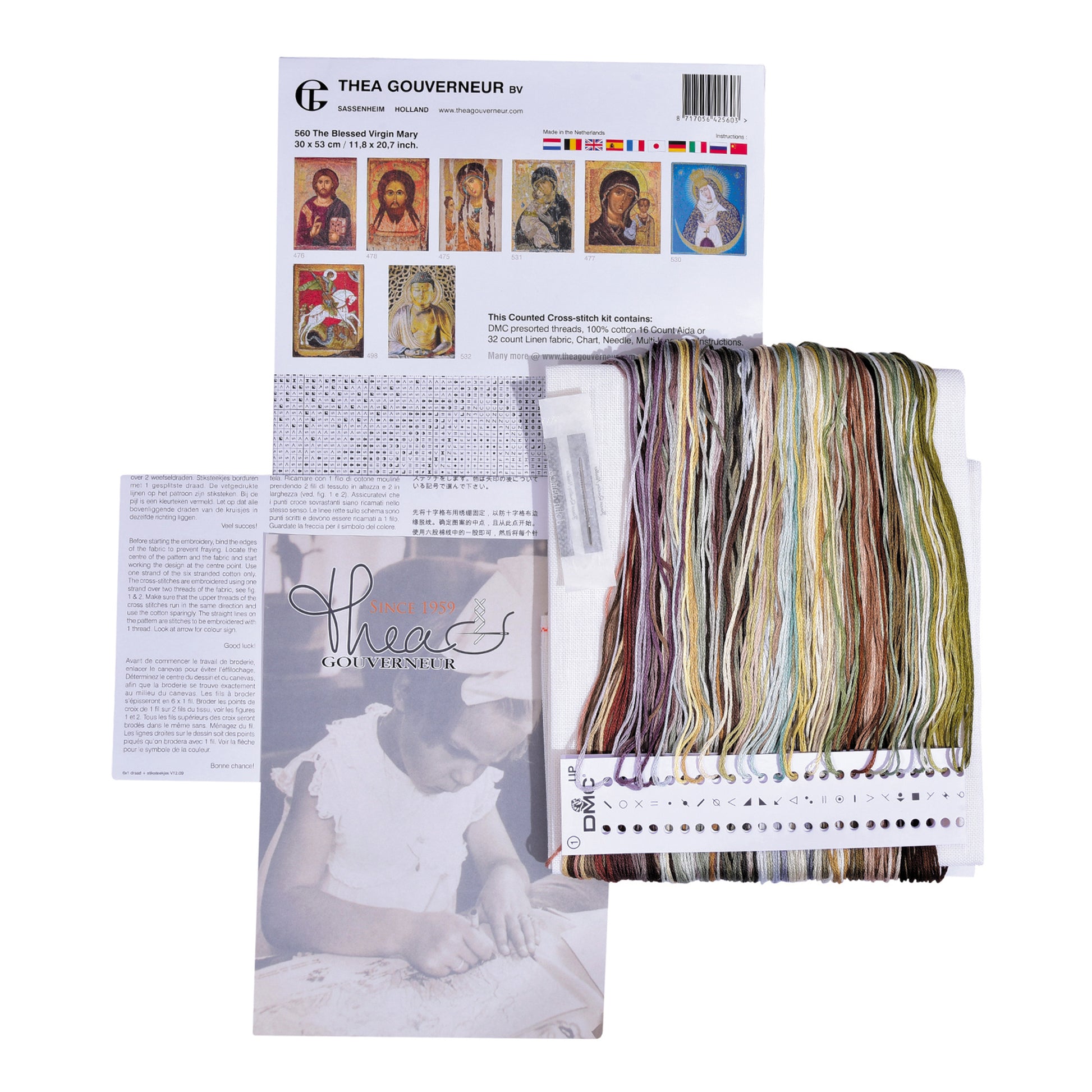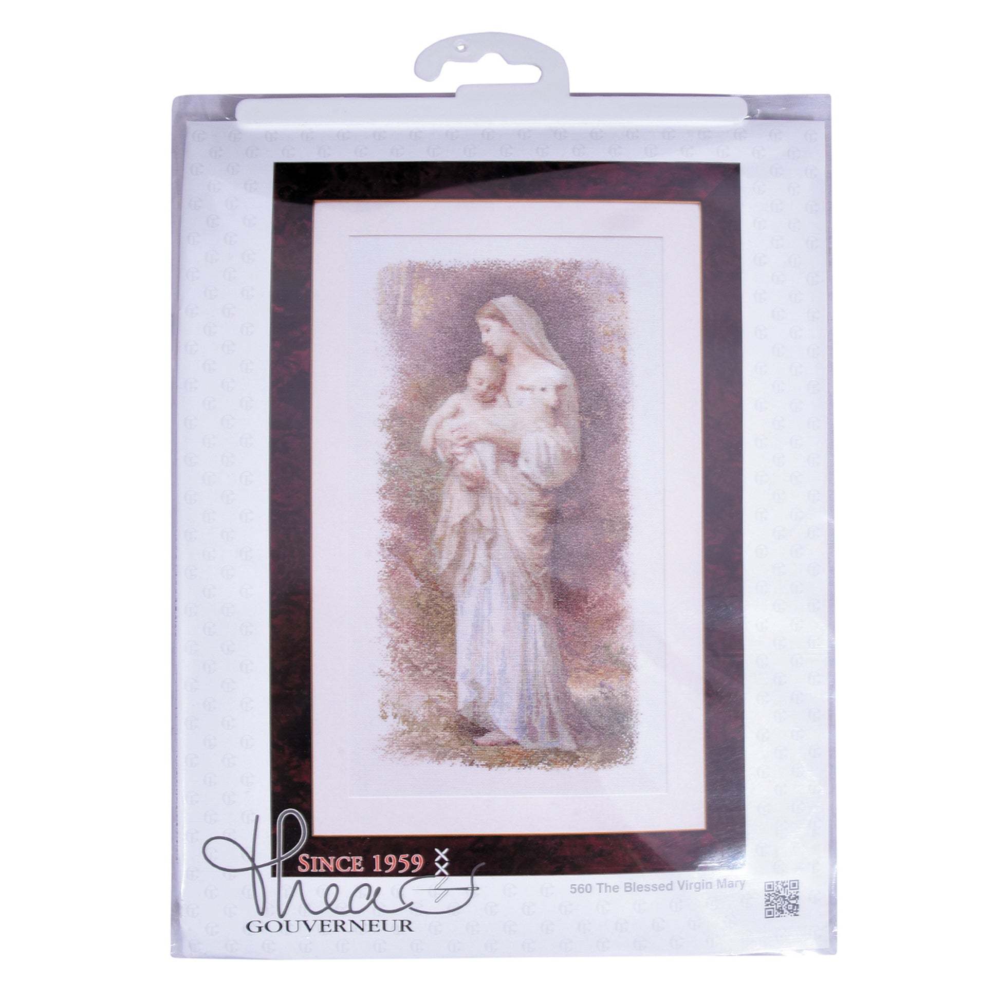 ONTWERP: Thea Gouverneur heeft een groot assortiment aan geteld kruissteekpakketten met een cultureel thema. Dit geteld kruissteekpatroon bevat The Blessed Virgin Mary