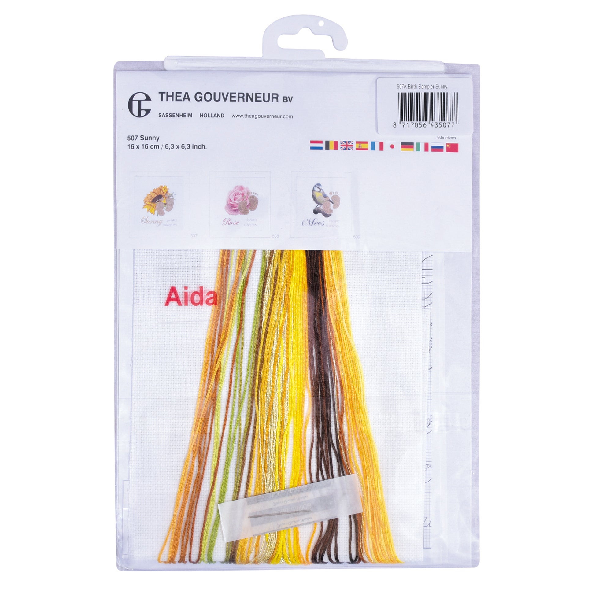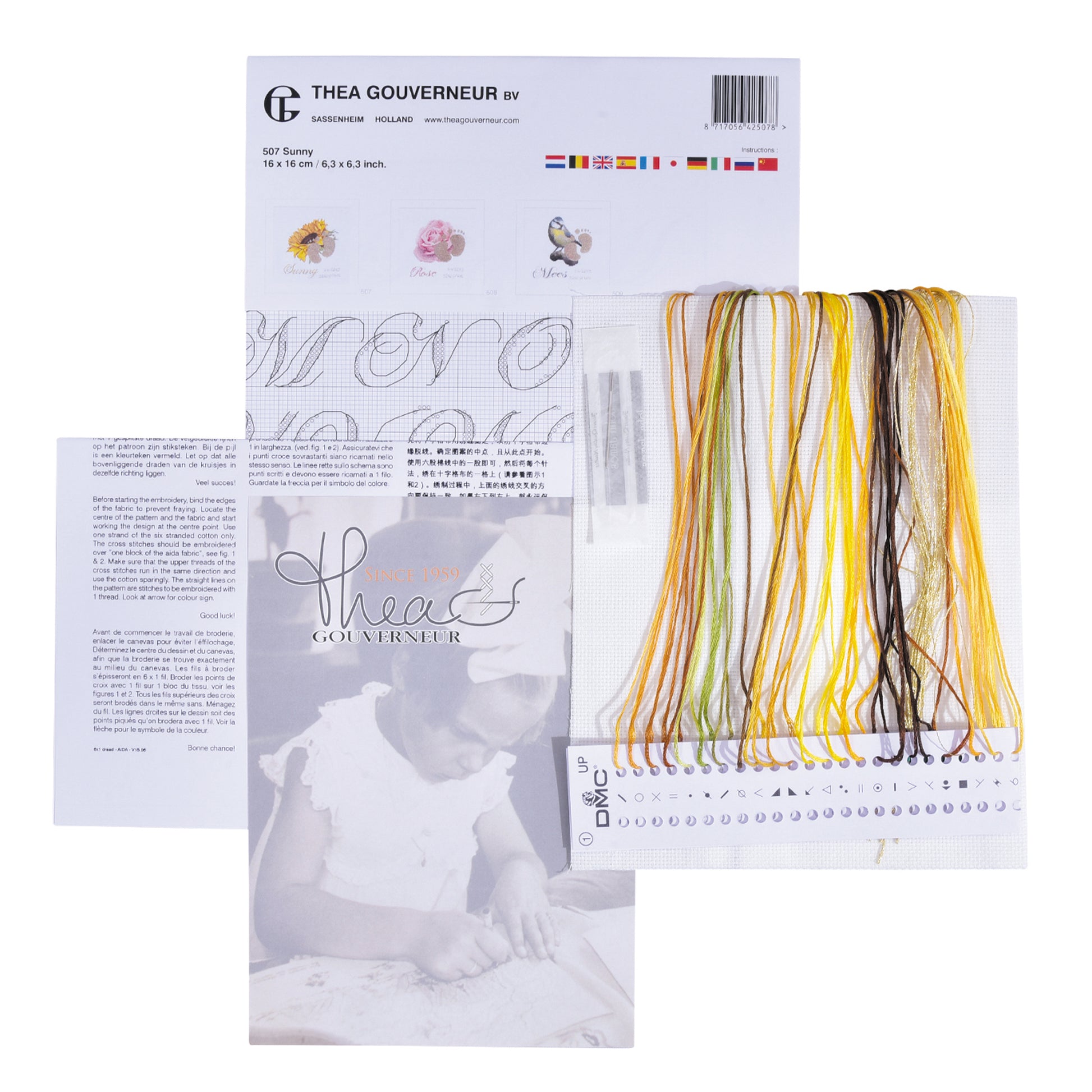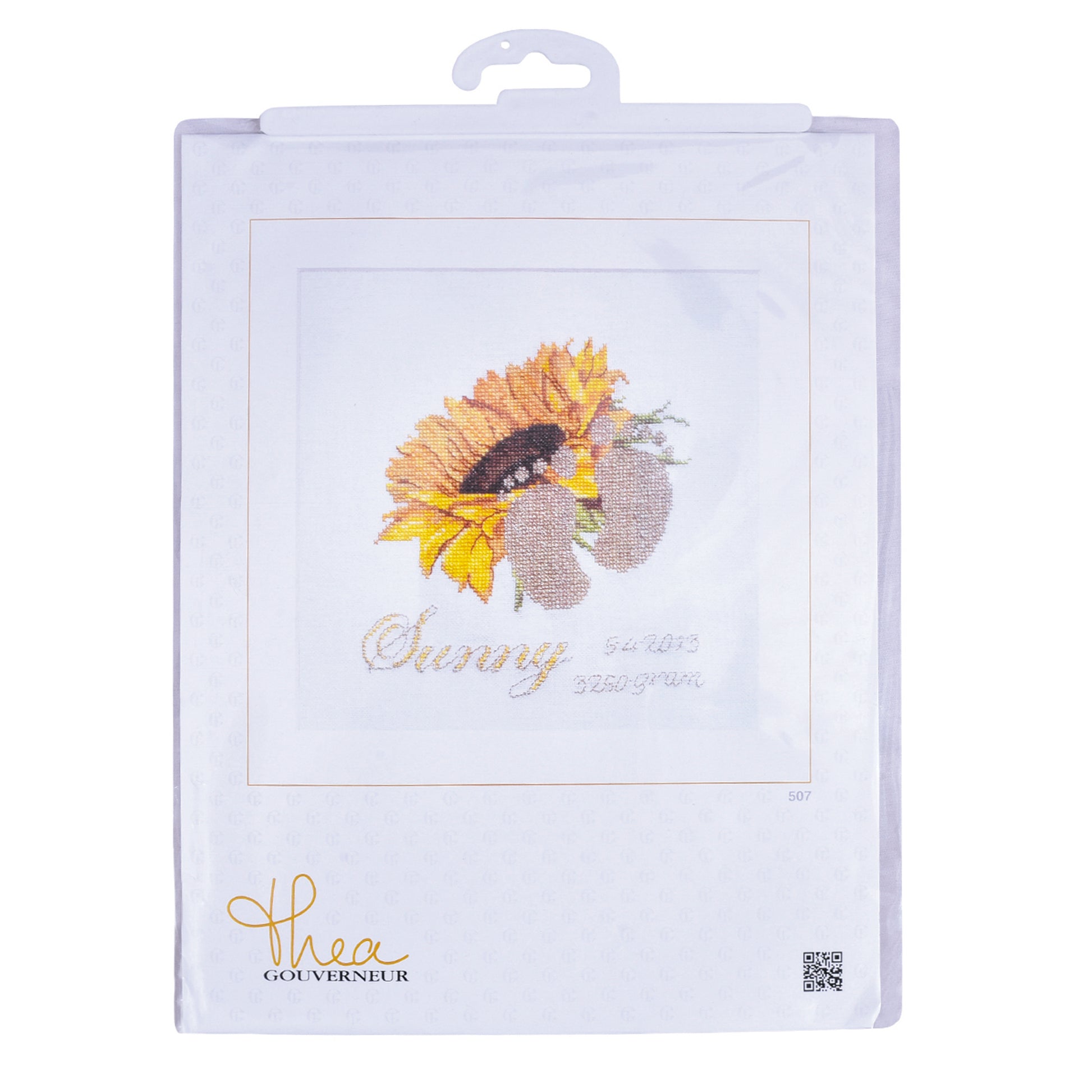 DESIGN: Nature-inspired designs are a highlight of the Thea Gouverneur cross stitch collection. This counted cross stitch pattern features a birth sampler with a sun