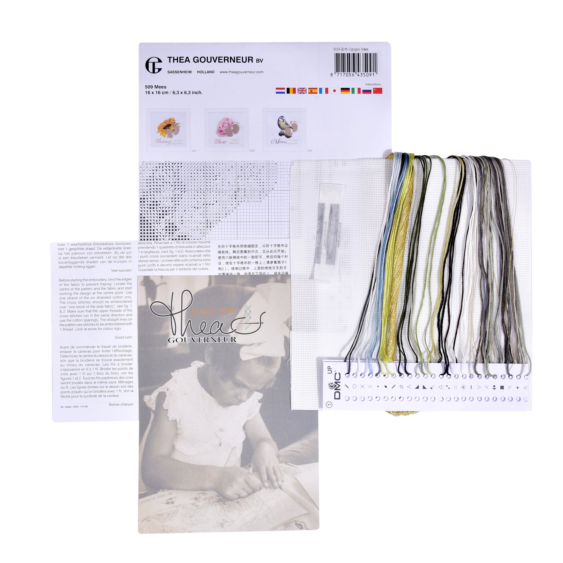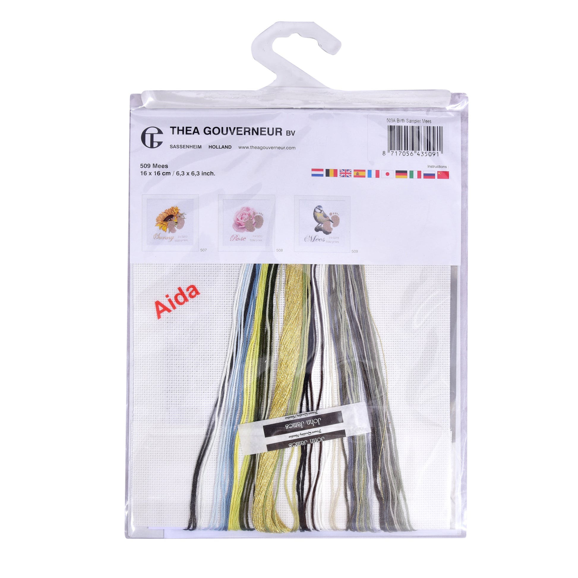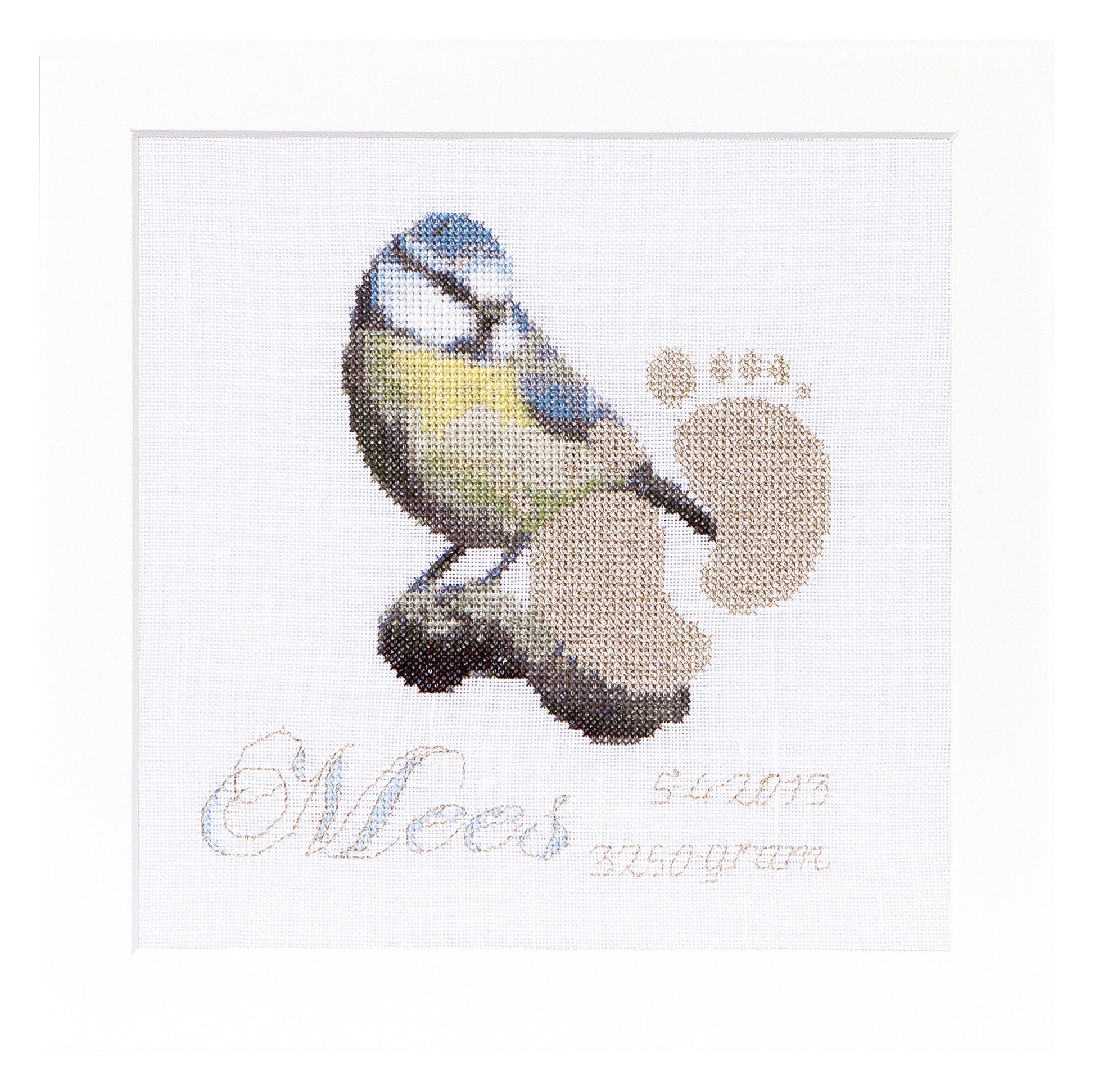 DESIGN: Nature-inspired designs are a highlight of the Thea Gouverneur cross stitch collection. This counted cross stitch pattern features a birth sampler with a tit