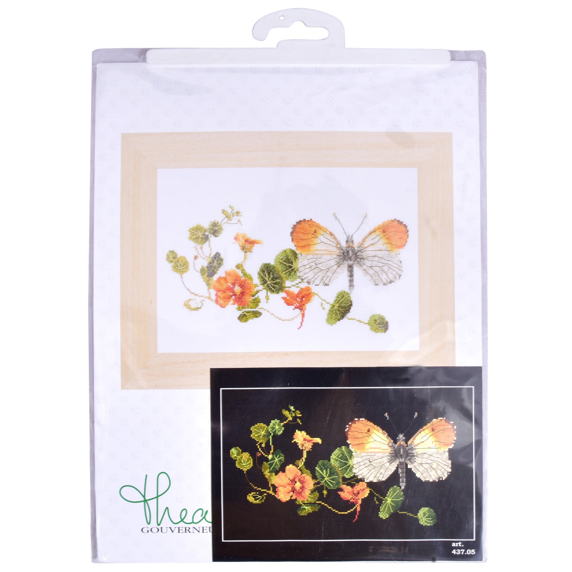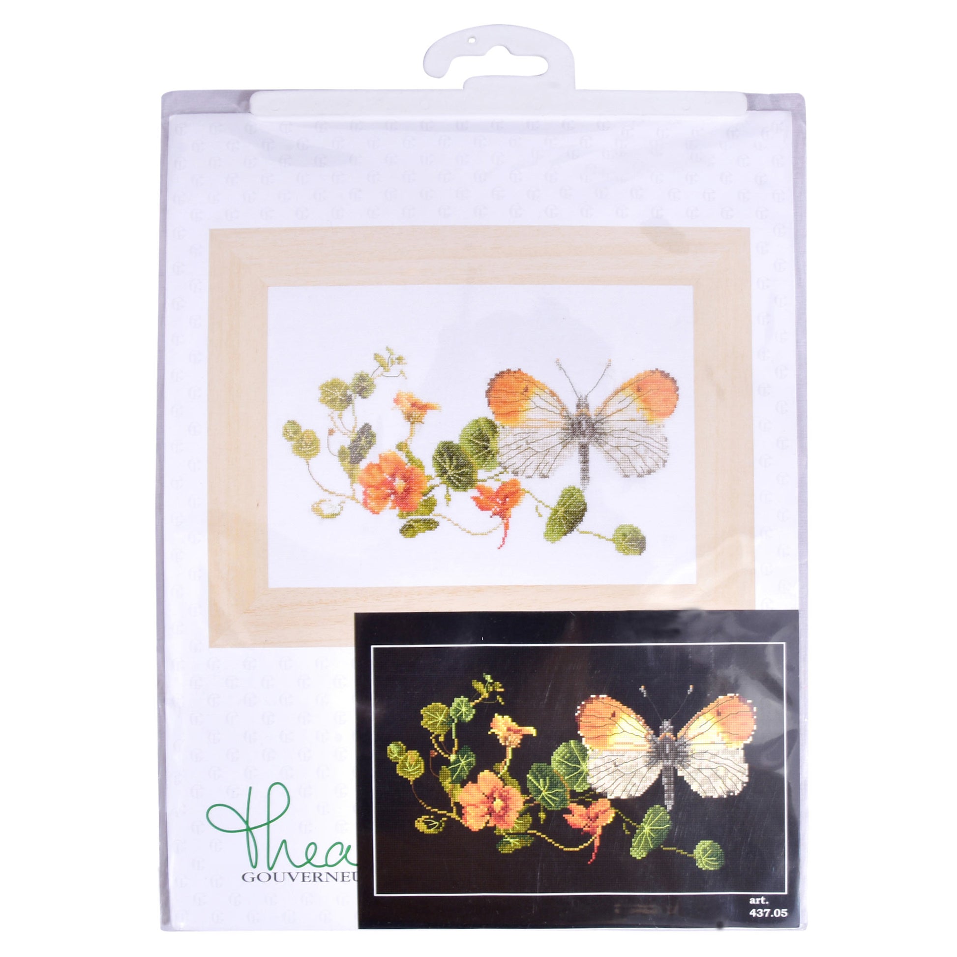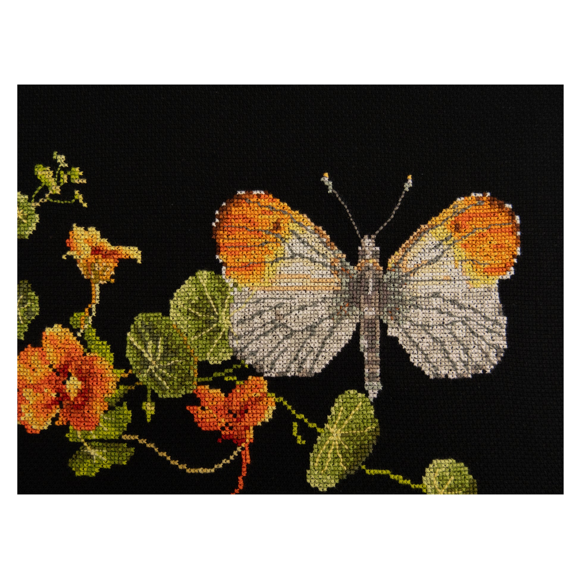 DESIGN: Nature-inspired designs are a highlight of the Thea Gouverneur cross stitch collection. This colorful counted cross stitch pattern features a butterfly and a nasturtium