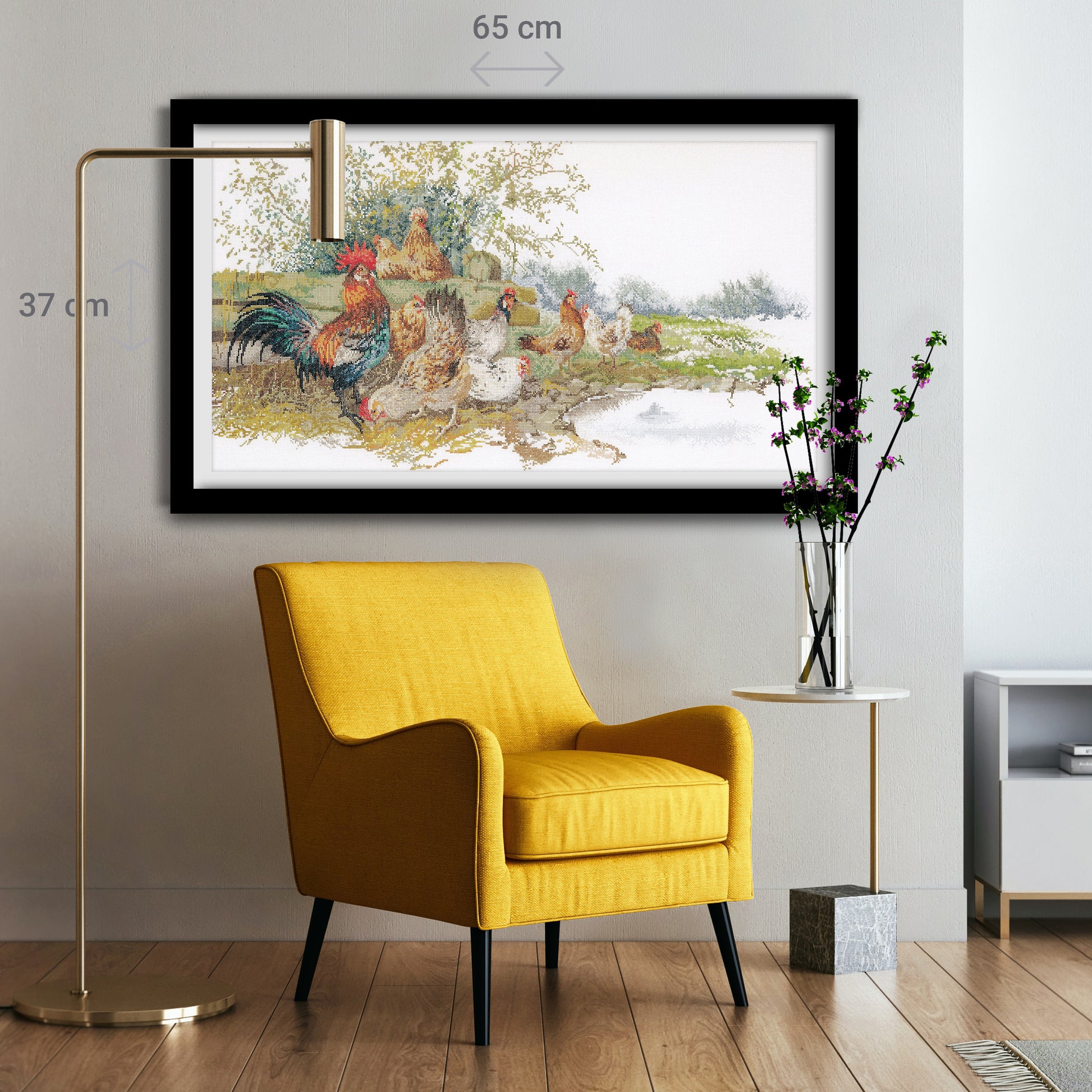 DESIGN: Nature-inspired designs are a highlight of the Thea Gouverneur cross stitch collection. This colorful counted cross stitch pattern features chickens in a field