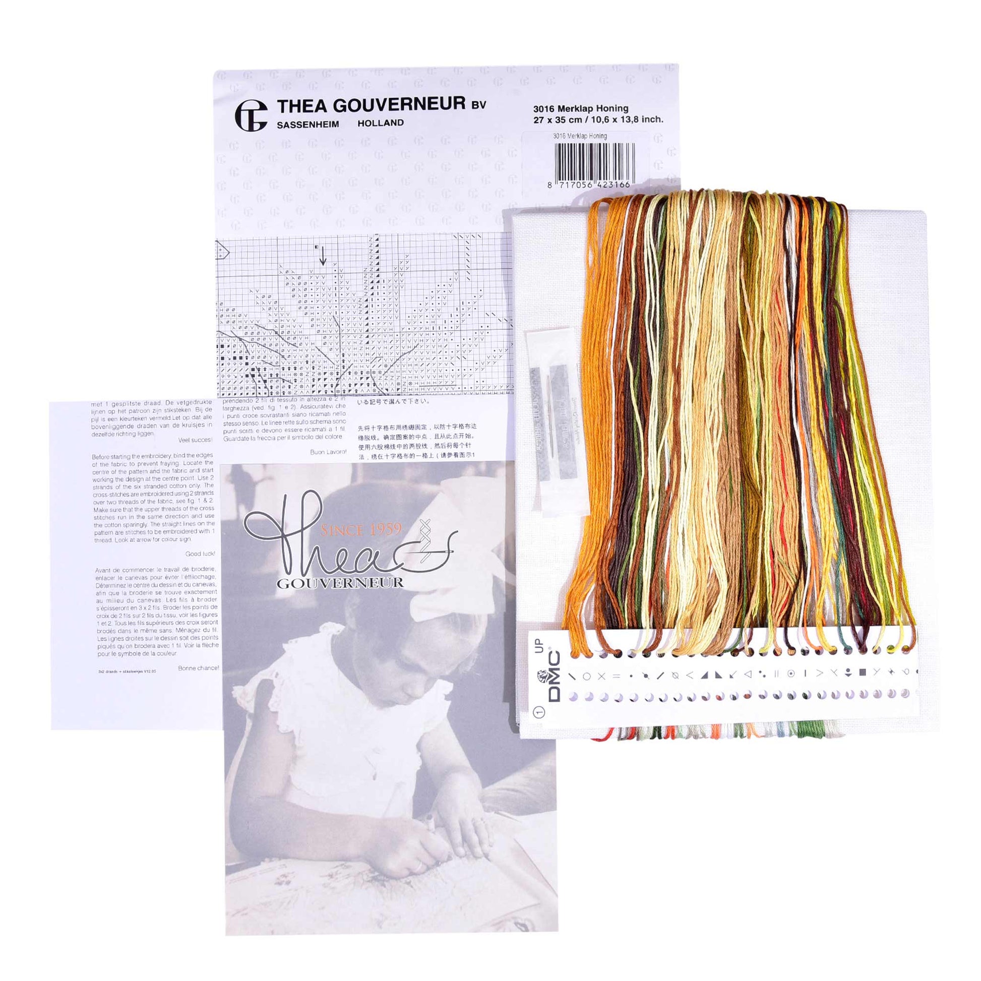 DESIGN: Nature-inspired designs are a highlight of the Thea Gouverneur cross stitch collection. This colorful counted cross stitch pattern features a sampler of honey and honeybees surrounded by flowers