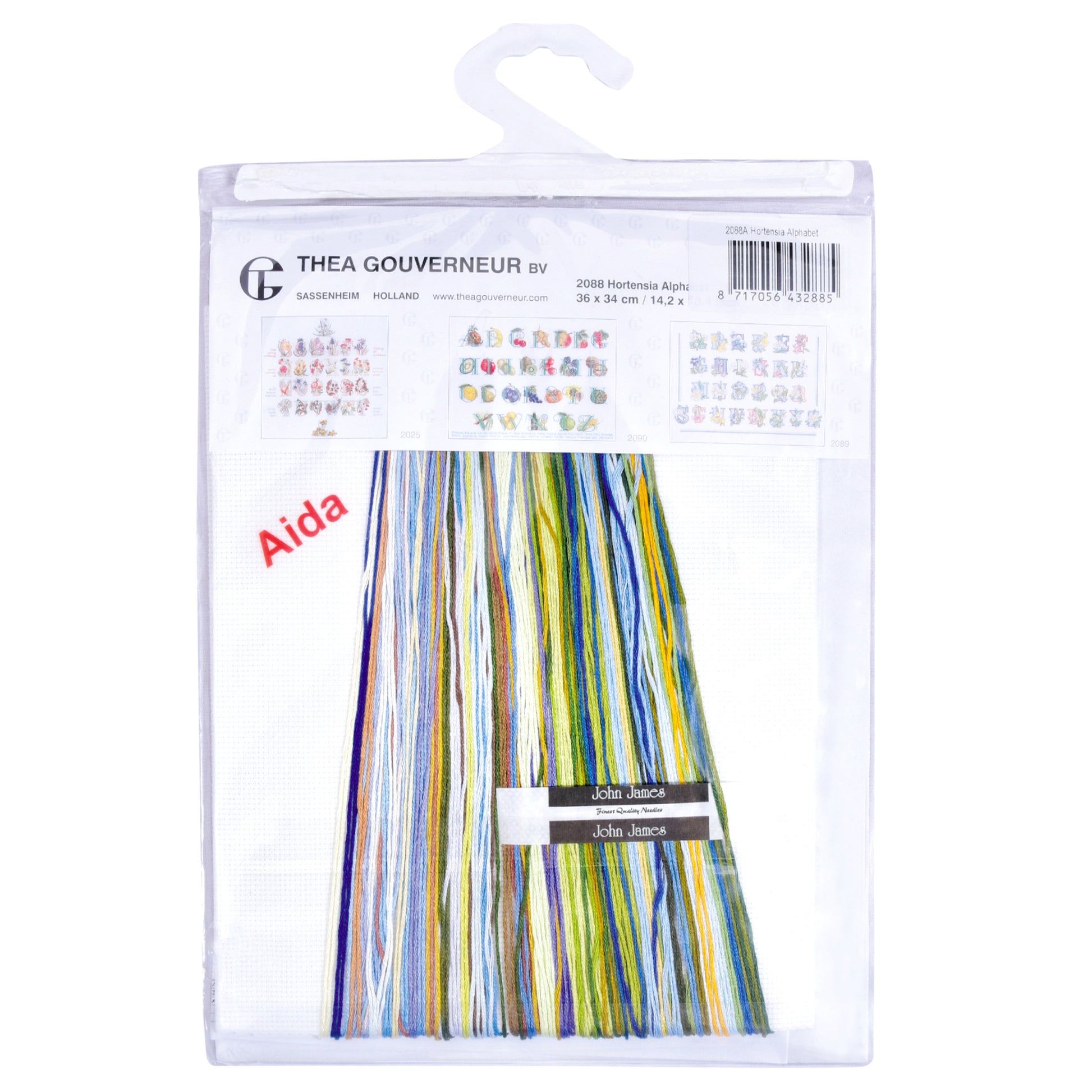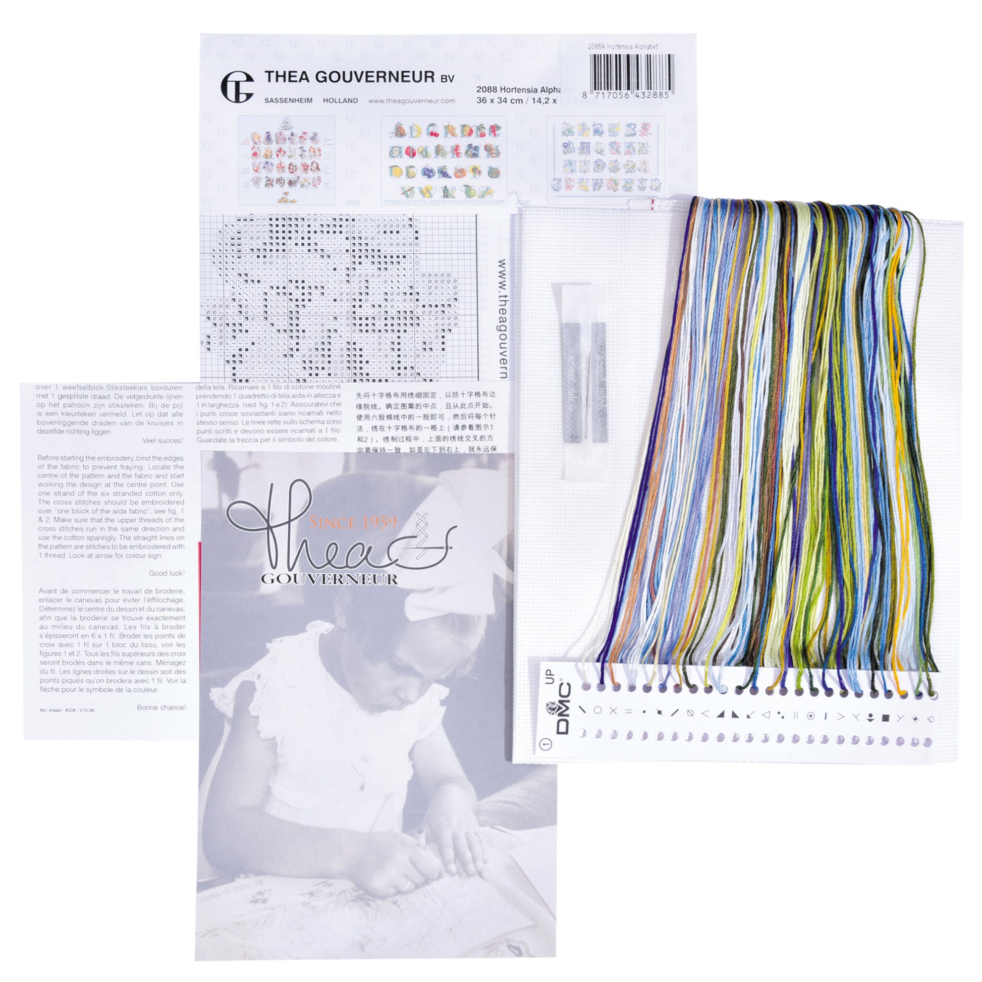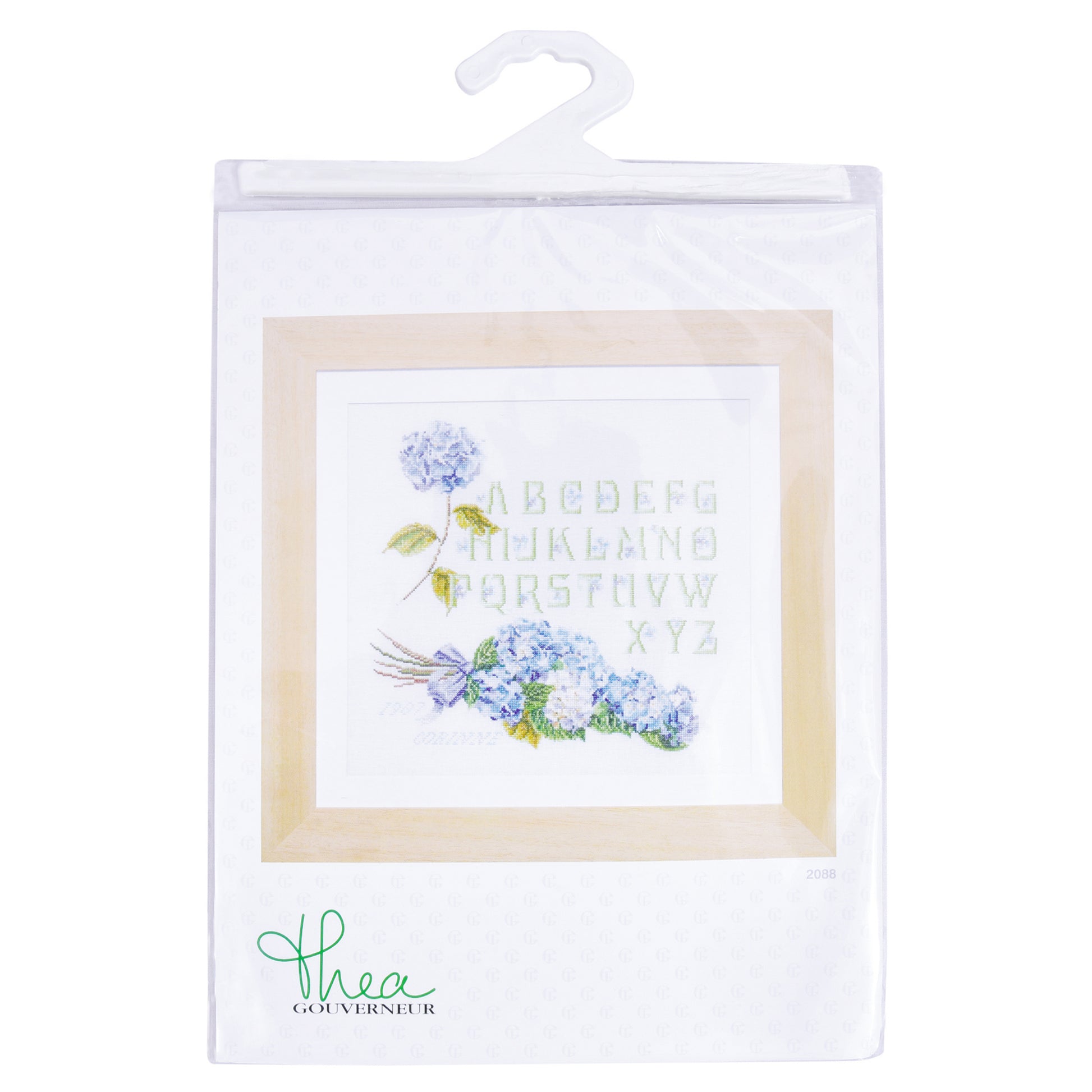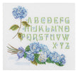 DESIGN: Nature-inspired designs are a highlight of the Thea Gouverneur cross stitch collection. This colorful counted cross stitch pattern features hydrangea flowers and the alphabet
