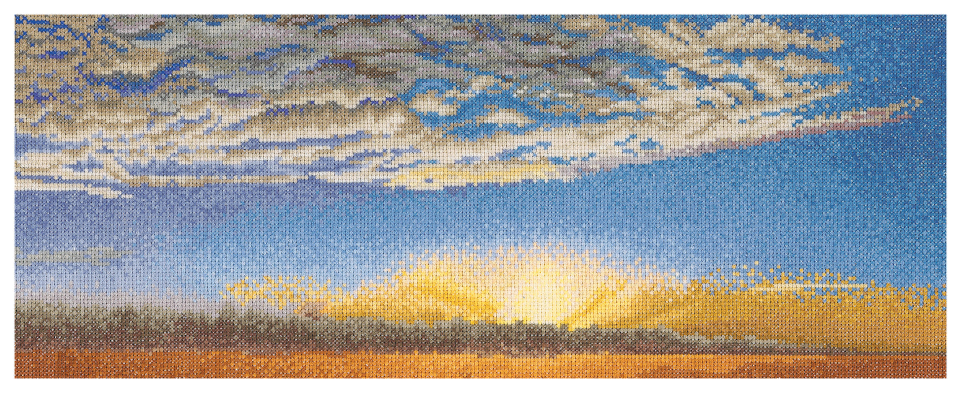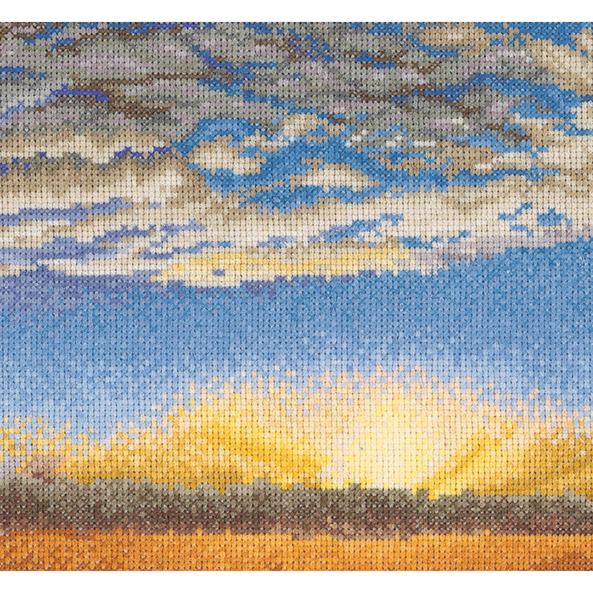 DESIGN: Nature-inspired designs are a highlight of the Thea Gouverneur cross stitch collection. This colorful counted cross stitch pattern features a beautiful sky with a sunset